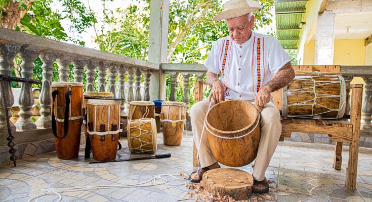 Lleva cuatro días confeccionando el instrumento y aunque parece que ha terminado, le preocupa el sonido. Para este músico veterano, la melodía debe ser perfecta, por eso ajusta el cuero y nuevamente hace una descarga de palmadas que hace vibrar el tambor. Asienta con la cabeza y solo entonces suelta la frase de victoria: “El tambor está listo”.